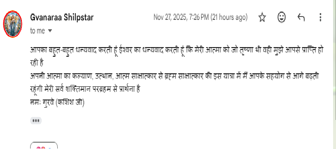 On this journey from self-realization to Brahm-realization, I know I will keep progressing with your guidance. Namah Gurave (Kashish ji).”